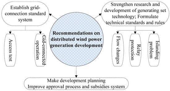 From Section 3.3 we can see that currently, the main problems of distributed wind power generation are focused on the technical standards of access to the grid and subsidies. To solve the problems above, recommendations are proposed as follows (Figure 6):
