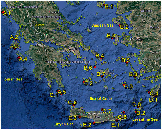 The geographical positions of the 26 reference points: (A) Ionian Sea; (B) Aegean Sea; (C) Sea of Crete; (D) Levantine Sea; and (E) Libyan Sea (figure processed from Google Earth (2017)).
