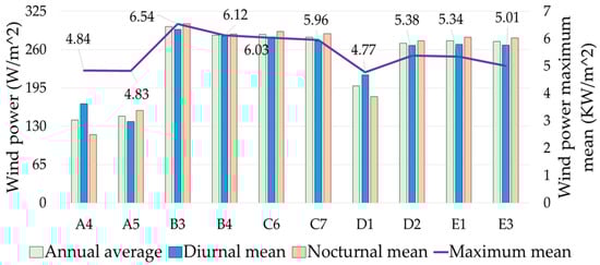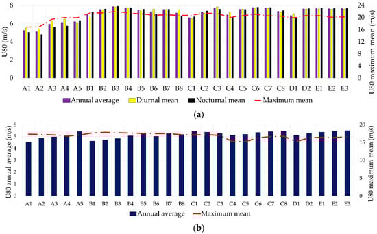 In choosing the most representative points for each of the five areas considered, the annual average values of the parameter U80 and also the maximum mean values were taken into account. Thus, by analyzing the ECMWF data set (Figure 2a), it can be noticed that, regarding the parameter U80, both the highest maximum mean and the annual average correspond to the reference points selected, which are A4 and A5 for zone A, B3 and B4 for zone B, C6 and C7 for zone C, D1 and D2 for zone D and E1 and E3 for zone E.