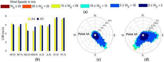 Figure 3 illustrates the wind conditions at 80 m heights for the two points located in zone A. The distribution by classes indicates that the wind intensity is mainly less than 10 m/s. By analyzing the results corresponding to the reference point A4, it can be noticed that the wind blows mainly from the SE (Figure 3c), while, for the reference point A5 from the SW, E and ESE (Figure 3d). The distribution by intervals (seasons and day periods) is presented in Figure 3b. It can be observed that the wind is more intense during the winter period. During the wintertime, the mean values are in the range 7.34–7.75 m/s, while, for the other periods, in the range of 4.59–6.35 m/s. Regarding now the diurnal and nocturnal periods, it can be noticed that, for the point A4, the wind is more intense during the diurnal period, while, for the point A5, it tends to be more active during the nocturnal period.