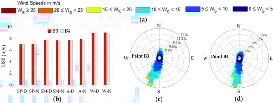 Zone B wind speed evaluation at 80 m height; (a) wind speed intervals associated with the wind rose charts; (b) wind speed mean values for different intervals of the period studied (1 January 2005 to 31 December 2015.); (c) wind roses corresponding to point B3; (d) wind roses corresponding to point B4.