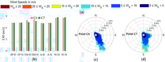 Zone C wind speed evaluation at 80 m height; (a) wind speed intervals associated with the wind rose charts; (b) wind speed mean values for different intervals of the period studied (1 January 2005 to 31 December 2015.); (c) wind roses corresponding to point C6; (d) wind roses corresponding to point C7.