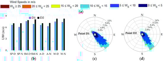 Zone D wind speed evaluation at 80 m height; (a) wind speed intervals associated with the wind rose charts; (b) wind speed mean values for different intervals of the period studied (1 January 2005 to 31 December 2015.); (c) wind roses corresponding to point D1; (d) point D2.