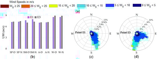 Zone E wind speed evaluation at 80 m height; (a) wind speed intervals associated with the wind rose charts; (b) wind speed mean values for different intervals of the period studied (1 January 2005 to 31 December 2015.); (c) wind roses corresponding to point E1; (d) wind roses corresponding to point E3.