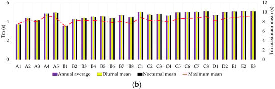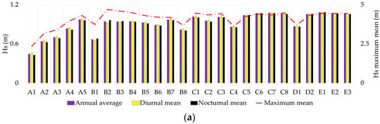 Figure 7 shows a detailed picture of the wave conditions close to the Greek islands by evaluating the parameters Hs and Tm for all the 26 reference points. As defined in Equation (5), the wave power is a combination between the square of the significant wave height and the wave period. For this study, the ECMWF data set was taken into consideration due to the fact that this data set is more complex. The ECMWF data also contain information about the wave period and direction and also covers a longer time period. The most representative points in terms of the wave energy potential were selected having as a basis the mean values of the parameters Hs and Tm. Thus, 10 reference points have been selected for a detailed analysis, two for each of the five zones. By analyzing the ECMWF data set (Figure 8), it can be concluded that the most appropriate points for the analysis of the wave intensity distribution are the same as the reference points previously considered for the wind analysis (A4 and A5 for zone A, B3 and B4 for zone B, C6 and C7 for zone C, D1 and D2 for zone D and E1 and E3 for zone E). From this perspective, in this subsection, there will be evaluated the parameters significant wave height (Hs) and the wave period (Tm) in terms of their mean values for the diurnal and nocturnal intervals. In addition, the evolution of these parameters was studied with respect to the four seasons each divided into two intervals. Thus, the intervals studied are: spring diurnal (SP-D), spring nocturnal (SP-N), summer diurnal (SM-D), summer nocturnal (SM-N), autumn diurnal (A-D), autumn nocturnal (A-N), winter diurnal (W-D) and winter nocturnal (W-N).