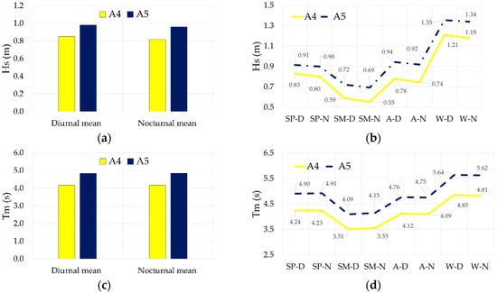 Zone A, evaluation of the wave conditions considering the ECMWF data for the 11-year interval 2005–2015; (a) Hs mean values comparison of diurnal against nocturnal for total time; (b) Hs mean values comparison of diurnal against nocturnal for each season; (c) Tm mean values comparison of diurnal against nocturnal for total time; (d) Tm mean values comparison of diurnal against nocturnal for each season.