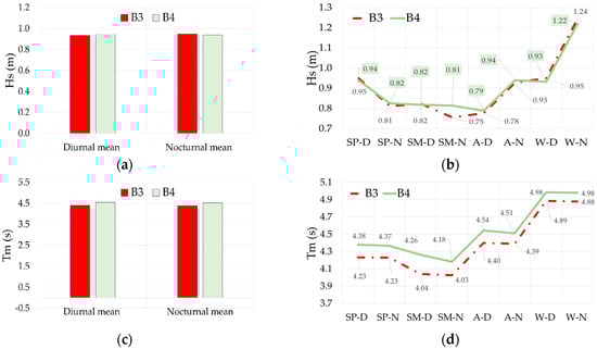 Zone B, evaluation of the wave conditions considering the ECMWF data for the 11-year interval 2005–2015; (a) Hs mean values comparison of diurnal against nocturnal for total time; (b) Hs mean values comparison of diurnal against nocturnal for each season; (c) Tm mean values comparison of diurnal against nocturnal for total time; (d) Tm mean values comparison of diurnal against nocturnal for each season.