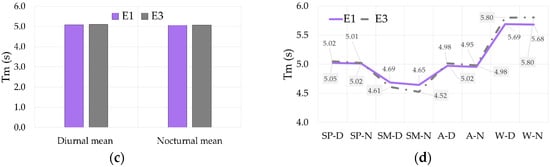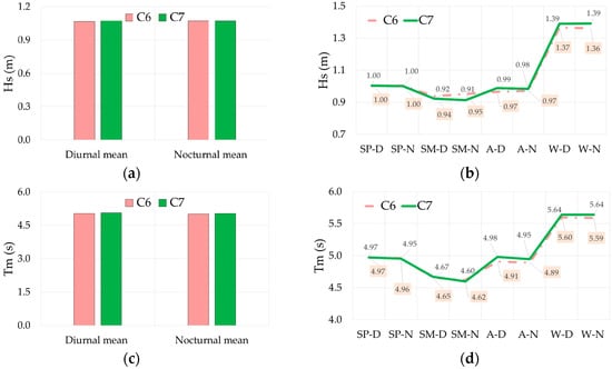 Zone C, evaluation of the wave conditions considering the ECMWF data for the 11-year interval 2005–2015; (a) Hs mean values comparison of diurnal against nocturnal for total time; (b) Hs mean values comparison of diurnal against nocturnal for each season; (c) Tm mean values comparison of diurnal against nocturnal for total time; (d) Tm mean values comparison of diurnal against nocturnal for each season.