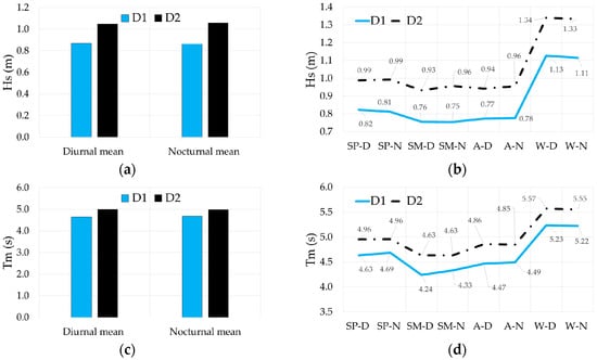 Zone D, evaluation of the wave conditions considering the ECMWF data for the 11-year interval 2005–2015; (a) Hs mean values comparison of diurnal against nocturnal for total time; (b) Hs mean values comparison of diurnal against nocturnal for each season; (c) Tm mean values comparison of diurnal against nocturnal for total time; (d) Tm mean values comparison of diurnal against nocturnal for each season.