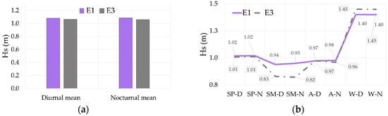 Figure 11 presents the analysis of the significant wave height and of the mean wave period for the points belonging to the Sea of Crete, corresponding to the time interval January 2005–December 2015. Regarding the parameter significant wave height, no noticeable differences can be observed by comparing the diurnal and nocturnal periods (Figure 11a). By analyzing the distribution by seasons, it can be noticed that both points had the same evolution. The highest values were recorded during winter diurnal nocturnal.