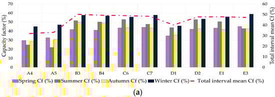 According to this study, the best suitable areas for a wind turbine implementation are the areas corresponding to the Aegean Sea, Sea of Crete and Libyan Sea. Figure 16 illustrates that the zone B points have a total mean Cf value of 50.22% for B3 and 49.35% for B4. By analyzing the operating capacity, it was noticed that it is quite high, 94.32% for point B3 and 93.83% for B4. The rated capacity for this zone indicates that a wind turbine has to function on average 23.03% of the time for point B3 and 22.36% for B4. Regarding the seasonal distribution, it can be noticed that the RC parameter increases during the winter. The next best area for a wind turbine implementation is the Libyan Sea. The mean value of the capacity factor of both zone E points is 47.64%. Regarding the operating capacity, it can be noticed that this has the values 96.98% in point E1 and 98.26% in E2. By analyzing the rated capacity, zone E has a mean of 16.49%. The Sea of Crete energy potential in the points studied is rather similar to that from area E. The point C6 is characterized by a Cf value of 49%, OC of 96.88 and RC of 17.51%, while point C7 by a Cf of 48.33%, OC of 96.99 and RC of 17.43%.