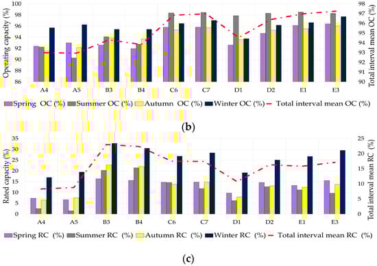 The operating time percentage of a wind turbine is indicated by the operating capacity parameter (Figure 16b). This parameter can be determined based on the cut-in wind speed (3 m/s) and the cut-out wind speed (25 m/s). The maximum performance of a wind turbine is highlighted by the rated capacity (Figure 15c). This parameter can be computed based on the rated speed (12.5 m/s) and the cut-out value.