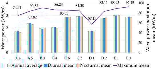 Wave power density, Pwave, annual average, diurnal mean, nocturnal mean and maximum mean, for the 10 reference points considered.