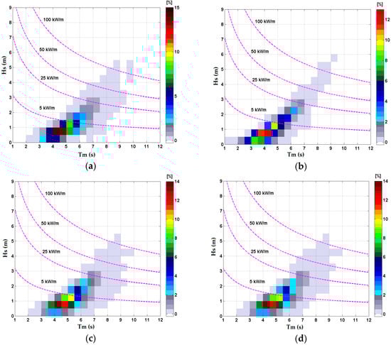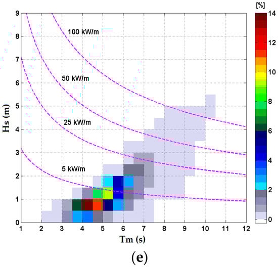 The bivariate distributions for the wave parameters (Hs and Tm) corresponding to five reference points are illustrated in Figure 18. These diagrams present the distribution of the sea states for each zone, being defined by the parameters significant wave height (Hs) and mean wave period (Tm), and they were designed for the 11-year interval from 1 January 2005 to 31 December 2015. Furthermore, the wave power isolines are represented for four different energy levels (5 kW/m, 25 kW/m, 50 kW/m, 100 kW/m).