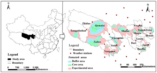 The third dataset, the standard precipitation index (SPI) for the study period, was calculated from precipitation data obtained from 13 weather observation stations in the study area, and recorded by the State Meteorological Bureau (Figure 1). The fourth dataset, moisture index (MI), was calculated using the Penman–Monteith equation and the Thornthwaite Moisture Index. The input data were daily maximum and minimum temperatures, daily precipitation, wind velocity, and actual water vapor pressure from 1984 to 2009. These data were also obtained from the 13 weather observation stations in Three Rivers Source Region and recorded by the State Meteorological Bureau. The fifth dataset, the annual mean temperature and precipitation in the vegetation-growing months, was obtained from the Data Center of the State Meteorological Bureau. The sixth dataset was livestock data, collected from local and state Statistics Bureau yearbooks. The seventh dataset, vegetation type and protected areas, was obtained from local governments.