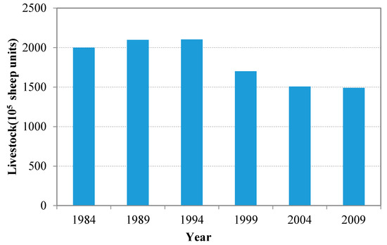 These results indicate that the Grain-to-Green and eco-migration policies improved the status of rangeland, and that the eco-migration policy played a more important role during the period while NDVI values were changing. Livestock are a symbol of wealth in Tibetan areas, and grazing is the main human activity affecting the status of rangeland in the study area. After the privatization of livestock and pastureland, the main objective of herdsmen was maximizing their wealth, and this caused the number of livestock to increase between 1984 and 1993 (Figure 3). In 1984, there were 2.0 × 107 sheep units, which subsequently increased to 2.12 × 107 sheep units in 1994. The increase in livestock caused the status of the rangeland to deteriorate from 1984 to 1993, and the death rate of the livestock also began to increase, which resulted in a decrease in the number of livestock after 1994.