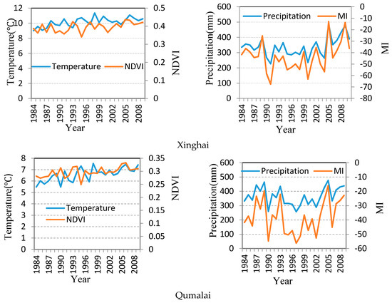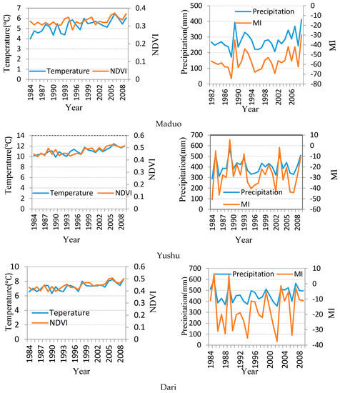Annual humid moisture in the vegetation-growing season was calculated using the Penman–Monteith equation and the Thornthwaite Moisture Index (Figure 4). In addition, the Pearson’s correlation coefficients between the MI, precipitation, and temperature with NDVI were calculated. The results are shown in Table 3. The annual humidity index and precipitation in the vegetation-growing months both showed the same trends during the period from 1984 to 2009. However, the trends in the MI and precipitation were not synchronous with the dynamics of the NDVI. The correlation coefficients between the NDVI and MI, and the NDVI and precipitation at the stations with annual precipitation higher than 400 mm were very low, and they were not significant at the 0.05% and 0.01% levels. This indicates that the precipitation and MI improved the status of alpine rangeland in the areas with annual precipitation greater than 400 mm, but that these effects were very small. However, the correlation coefficients between the NDVI and MI, and the NDVI and precipitation at the stations with precipitation less than 400 mm were markedly higher, and they were significant at the 0.05% or 0.01% levels at most of the stations. This shows that the precipitation and MI played important roles during the process of improvement in the status of alpine rangeland at the stations at which the annual precipitation in the vegetation-growing months was less than 400 mm.