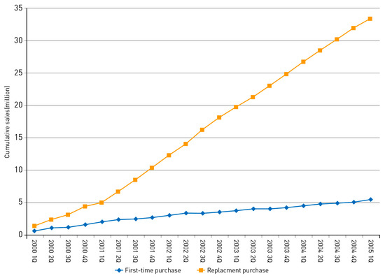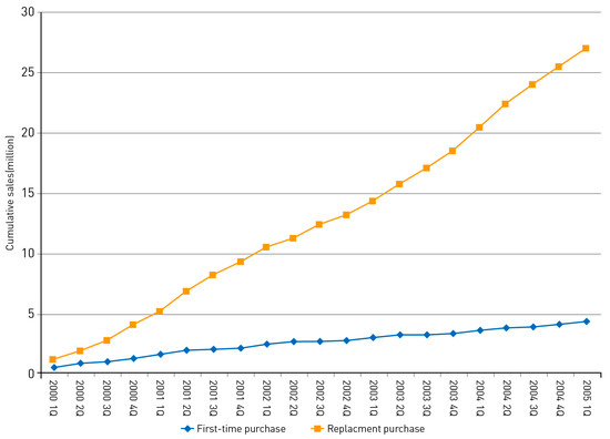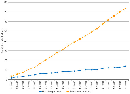 Diffusion models that take into account replacement and repeat purchases have a long history in the forecasting literature. Representative examples of early works are Dodson and Muller [17], Lilien et al. [18], Mahajan et al. [19], and Kamakura and Balasubramanian [20], which incorporated consumers’ subsequent purchase behavior, as well as their first-time purchase behavior. Recently, a few studies used novel methods, such as choice models [21] and agent based simulations [22], to analyze innovation diffusion of repeat purchase technologies. The diffusion models incorporating replacement and repeat purchases are widely applied to analyze the market dynamics of several products, as well as technologies, such as ethical drugs [23], motor vehicles [24], televisions [25], PC processors [26], and mobile handset units [27]. Despite their usefulness, such models are hampered by some limitations. First, some of them limit the research focus to nondurable technologies, such as pharmaceuticals [10,18]. Second, although other studies, such as Bass and Bass [28] and Bayus et al. [9], propose models that apply to durable products, those models are limited in that they neglect to account for marketing efforts and firms’ strategies that affect consumers’ subsequent purchase behavior. Third, most studies taking replacement and repeat purchases into account were applied only to a single technology category. Therefore, they failed to incorporate the competitive environment into the model, even though technology diffusion at the brand level is an important issue in most industries. Another drawback of existing models is that they do not separately identify first-time purchases and replacement purchases and, instead, use only aggregate sales data. Finally, the existing models do not estimate the replacement purchase rate, which may vary over consumers’ different replacement cycles.