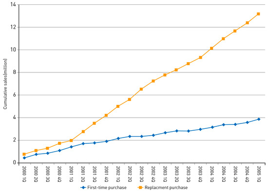 Quarterly sales to first-time purchasers and replacement purchasers (cumulative since 2000): The total of all players.