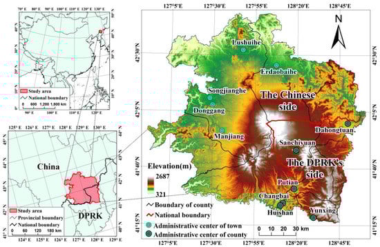 The transnational area of Changbai Mountain (TACM) mainly refers to the mountainous area that runs across southeastern Jilin province in China and the northern parts of Democratic People’s Republic of Korea (DPRK) [1]. Approximately 80% of the TACM is covered by forest; it constitutes one of the largest protected temperate forests in the world and serves as home to the last stands of virgin Korean pine and mixed hardwoods that include several endangered species [2,3,4]. In addition, the TACM includes the headwaters of the Tumen, Songhua, and Yalu Rivers, and it plays an indispensable role in maintaining biodiversity, water retention, soil conservation, carbon sequestration, and ecological security in the watersheds of these three rivers. Therefore, the TACM is crucial for sustainable development in China, the DPRK, and all of Northeast Asia [2,5,6,7].