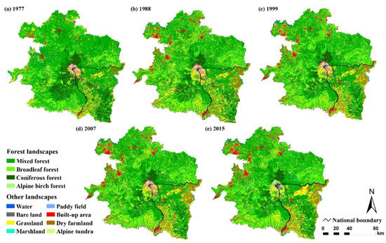 Presently, three main types of method are used to extract forest from remote sensing images, including unsupervised classification, supervised classification, and visual interpretation. Although the visual interpretation requires a large amount of human resources, it shows high accuracy and reliability [29]. Thus, we extracted forest from the Landsat data spanning 1977 to 2015 through visual interpretation. First, we developed interpretation criteria for each land use/cover type based on combination of Landsat bands, the sampling points from field survey data, and the regional forest resource map (Appendix A). These land use/cover types included coniferous forest, broadleaf forest, mixed forest, alpine birch forest, grassland, paddy field, dry farmland, water, marshland, bare land, built-up area, and alpine tundra. The interpretation criteria included the features on spectrum, shape, and texture as well as the mainly distributed area (Appendix A), and were developed by identifying such features of sampling points from field survey in terms of different land use/cover types. Second, we performed a visual-interpretation-based land use/cover classification of Landsat data using the interpretation criteria to obtain the spatial patterns of each land use/cover type in 1977, 1988, 1999, 2007, and 2015 (Figure 2). During the visual interpretation, the standard false color composite images based on green, red, and near-infrared bands were primarily used as references, while the information on short wave infrared band were used as supplement. In each year, we identified the land use/cover type pixel by pixel according to the differences on spectral characteristics and the shape and texture features among various land use/cover types (Appendix A). Finally, we assessed the overall forest distribution by integrating coniferous forest, broadleaf forest, mixed forest, and alpine birch forest from the obtained land use/cover data.