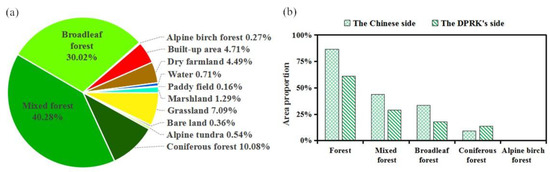 The forest in the TACM in 2015: (a) the proportion of forest in the total area; and (b) the forest proportions on the Chinese and DPRK sides.