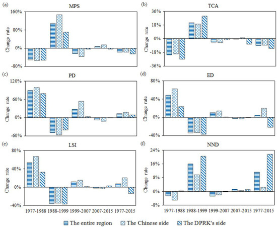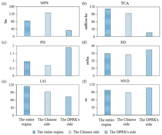 The DPRK’s side experienced faster declines of MPS and TCA as well as more rapid growth of NND than did the Chinese side (Figure 7). Specifically, the MPS and TCA on the DPRK’s side decreased by 24.68% (from 42.42 ha to 31.95 ha) and 12.86% (from 0.19 million ha to 0.17 million ha), respectively. On the Chinese side, MPS and TCA decreased by 16.91% (from 150.30 ha to 124.88 ha) and 8.22% (from 1.02 million ha to 0.94 million ha), respectively (Table 4). The decrease rates of MPS and TCA on the DPRK’s side were 1.46 and 1.56 times greater than those on the Chinese side, respectively. In addition, the growth of NND (21.67%, from 88.51 m to 107.69 m) on the DPRK’s side was 9.22 times that (2.35%, from 87.36 m to 89.41 m) on the Chinese side (Table 4).