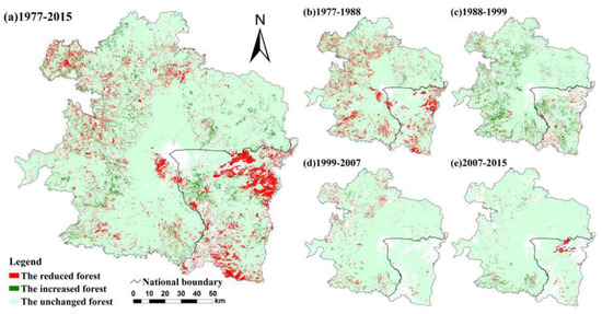 The spatial dynamics of forest in the TACM from 1977 to 2015: (a) the dynamics from 1977 to 2015; (b) the dynamics from 1977 to 1988; (c) the dynamics from 1988 to 1999; (d) the dynamics from 1999 to 2007; (e) the dynamics from 2007 to 2015.