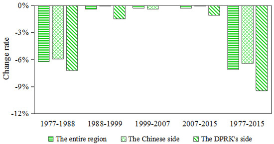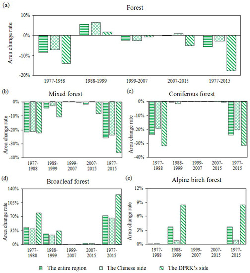 While both sub-regions experienced forest decreases, the DPRK side had a higher rate of forest loss from 1977 to 2015 (Figure 6a). The forest on the DPRK’s side decreased from 0.31 million ha to 0.25 million ha (a decline of 17.75%), whereas the forest on the Chinese side decreased from 1.27 million ha to 1.23 million ha (a decline of 2.86%) (Table 3). The rate of decline of the forest on the DPRK’s side was 6.21 times greater than that on the Chinese side. Across the four periods, both sides experienced the fastest rate of forest decrease between 1977 and 1988 (Figure 6a). Among the four types of forest, mixed forest underwent the most obvious decrease on both sides, followed by coniferous forest (Figure 6b,c).