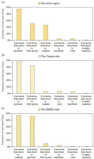 Conversion from forest to other land use/cover types in the TACM from 1977 to 2015: (a) the conversion in the entire region; (b) the conversion in the Chinese side; (c) the conversion in the DPRK’s side.