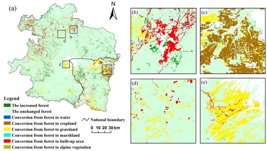 The spatial patterns of the conversion from forest to other land use/cover types in the TACM from 1977 to 2015: (a) the entire region; (b) urban expansion; (c) agricultural reclamation; (d) timber harvesting; and (e) typhoon disaster induced-area.