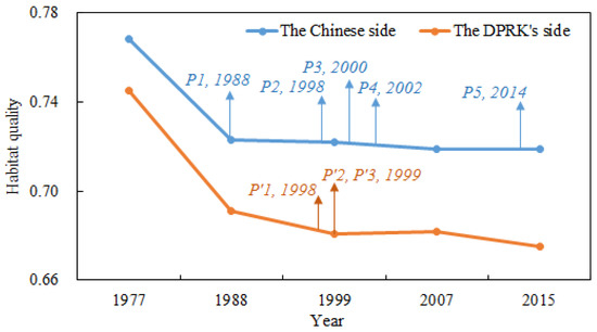 At present, both China and the DPRK have developed a series of policies and regulations to protect the forest and habitat quality in the TACM (Figure 11). For example, China issued the “Changbai Mountain National Nature Reserve Management Regulations in Jilin Province” directive in 1988, the amended “Land Management Law of the People’s Republic of China” in 1998, the “Implementation program for the Northeast, Inner Mongolia and other key state-owned forest natural resources protection project” in 2000, “a number of opinions on further improving the policy of Grain for Green” in 2002, and “a new round for the overall program of Grain for Green” in 2014 [21,39]. Simultaneously, the DPRK developed the “Land and Environmental Conservation Management Law” in 1998 and amended its “Forest Law” and “Environmental Protection Law” in 1999. As a result of the implementation of these policies and regulations, the decline rate of habitat quality obviously slowed after 1988 in the Chinese side and 1999 in the DPRK’s side, respectively (Figure 11).