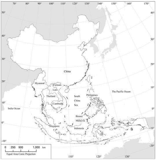 The research areas were mainland China and ASEAN countries. ASEAN nations include Myanmar, Thailand, Cambodia, Laos, Vietnam, Indonesia, Malaysia, the Philippines, Singapore and Brunei. The total area of ASEAN countries is about 4.479 million km2, with a population of 618 million (2014 data). ASEAN countries have a very important geopolitical position, being located south of China, north of Australia, west of the Pacific Ocean and east of the Indian Ocean (Figure 1). They connect three continents (Asia, Africa and Oceania) and are thus in a high-traffic area. For northeast Asian countries, the Malacca Strait is the shortest sea route to Europe or Africa.