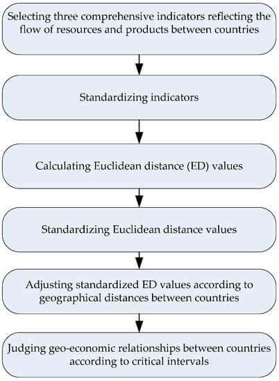 The method to measure geo-economic relationships is as follows (Figure 2): First, we selected three comprehensive indicators that reflected the differences in resources and products between countries and standardizes them. Second, Euclidean distance (ED) values were calculated and standardized. Third, the standardized ED values were adjusted according to geographical distances between countries, namely geographic location weight multiplied by standardized ED. Finally, the geo-economic relationships between China and ASEAN countries in a certain year could be judged according to the critical intervals of ED. We measured the geo-economic relationships every five years, from 1980 to 2014, for a total of eight periods.