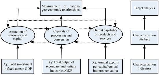 The measurement and analysis of geo-economic relationships draw on the theory of regional economic competitiveness. Regional economic competitiveness refers to the ability of a region to compete with other regions for market share and resources, or a region’s optimal allocation of resources relative to other similar regions [34]. From an economic point of view, the core of regional competitiveness is the ability to compete for market share and allocate resources. This ability is reflected in three aspects: the attraction of resources and capital, the efficiency of processing and conversion, and the output capability of products and services [25]. Based on this viewpoint, we designed a theoretical framework to measure national geo-economic relationships (Figure 3).