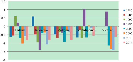 In the early 1980s, from the perspective of investment efficiency and capital, China, Thailand, Indonesia, Malaysia, and the Philippines were in capital shortage. The capital of Singapore was abundant (X1 = 0.395). Thus, China and Singapore were complementary in capital. Meanwhile, China had competition with Thailand, Indonesia, Malaysia and the Philippines for foreign direct investment. In terms of industrialization level and labor efficiency, Singapore was the highest (X2 = 0.948), followed by Malaysia, Thailand, Indonesia, the Philippines. China was comparatively lowest (X2 = 0.701). As for the outward flow of resources and products, Indonesia (X3 = 2.022) and Malaysia (X3 = 1.198) were more likely to export resources and products.