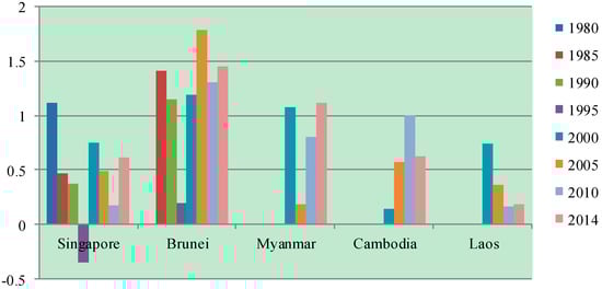 In the same period, Singapore, Brunei, Myanmar, Cambodia and Laos maintained complementary geo-economic relationships with China in general (Figure 5). In 2005, the complementary value between Brunei and China was the highest. The complementary geo-economic relationship between China and Cambodia continuously strengthened, while the complementary geo-economic relationship between China and Laos weakened. Singapore had a complementary geo-economic relationship with China, except in 1995, and it followed a weakening trend.