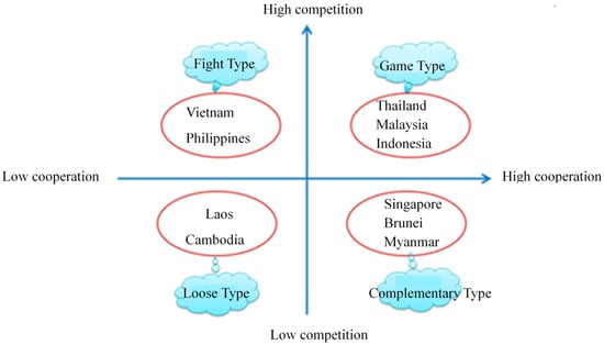 According to the measurement of geo-economic relationships between China and ASEAN countries, we classified geo-economic relationships into four types to reflect competition and cooperation more clearly and fully: (1) game type, with high cooperation and competition, such as with Thailand, Malaysia and Indonesia; (2) complementary type, with high cooperation and low competition, such as with Singapore, Brunei and Myanmar; (3) fight type, with low cooperation and high competition, such as with Vietnam and the Philippines; and (4) loose type, with low cooperation and competition, such as with Laos and Cambodia (Figure 6).