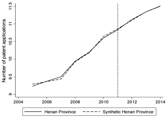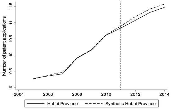 Figure 2 depicts Hubei and the synthetic control method of the synthesis of Hubei enterprises in the region of innovation. As can be seen from the figure, before the implementation of carbon trading policy, the path of the two is almost completely equal, which means that the synthesis of Hubei Province is a very good copy of the carbon trading policy before the implementation of the Hubei enterprise innovation growth path. After the implementation of the carbon trading policy in 2011, the number of patent applications (in log) in the real Hubei Province began to decrease compared to the number of patent applications in synthetic Hubei Province, and the gap between them gradually widened. The gap between the two means that, compared with the implementation of carbon trading policy in Hubei Province, the implementation of carbon trading policy reduces the innovation of enterprise in Hubei. Assuming that there is no implementation of carbon rights trading policy in 2014, enterprises in Hubei province applying for patent value should be 11.58 (in log), which is the actual number of patent applications with a value difference of 0.1, a decline of about 1%.