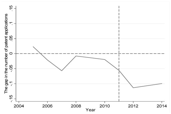 In order to more intuitively observe the impact of carbon trading policy on the path of innovation growth in Hubei enterprise, we calculated the gap of the number of patent applications (in log) between the enterprises in the real Hubei and the enterprises in synthetic Hubei before and after the implementation of the carbon trading policy, as shown in Figure 3. In 2011, before the implementation of the policy, the gap between the two is −0.05 to 0.05 fluctuating between the ups and downs. After 2011, the number of patent applications of the real Hubei was 0.113, 0.107, and 0.009 lower than the number of the synthetic Hubei applications, respectively. As seen from the results of the calculation, the implementation of the carbon trading policy has changed the original path of innovation growth in Hubei enterprises to a certain extent. The degree of change has gradually expanded with the passage of time. Specifically, the implementation of the carbon trading policy has reduced the innovation activities of enterprise in Hubei, proving H1.