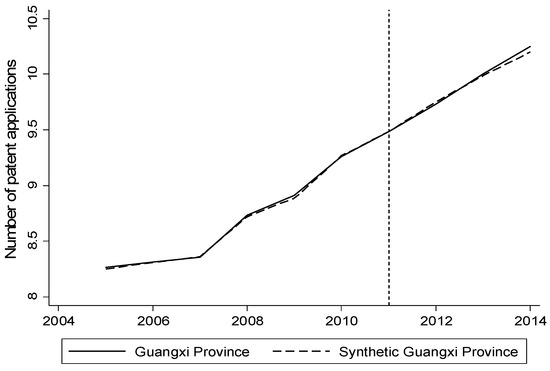 Based on the placebo test from Table 1, we can see Henan Province is the largest weight whose value is 0.469, nearly be half of the whole weight. At this point, we not only select the largest weight of Henan Province, but also select Guangxi Province whose weight is 0 as a test object. The reason is that the maximum weight indicates that Henan and Hubei are the most similar, and the weight of 0 shows that Guangxi and Hubei are very different in the various characteristics, the two most extreme cases as a test object can be used as a most effective proof to confirm the robustness of the conclusions. The results of the specific placebo test are shown in Figure 4 and Figure 5. For Henan and Guangxi, before and after the implementation of carbon trading policy, the path of innovation in real areas is consistent with the path of the synthetic control group. There is almost no gap between the two provinces, with a good degree of coincidence. Compared with the results shown in Figure 1, the results show that Henan and Guangxi did not change before and after the implementation of the policy, so to a certain extent, it proved that the carbon trading policy caused a decline in regional enterprise innovation, rather than being caused by the accidental factors.