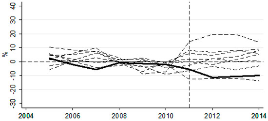 Figure 6 shows the deviation distribution after removing eight provinces. It can be seen that before 2011, the gap between deviation of Hubei Province and the deviation of other provinces is not large, and after 2011, the gap has been gradually increased. The gap in Hubei Province is located outside the distribution of most provinces, although there is an area below the province of Hubei. This means that the condition where we want to select a province at random to get the same significant effect of carbon trading policy as Hubei province is not a small probability event. This indicates that the impact of carbon trading policy is significant. After a series of robustness tests, the carbon trading policy has had a negative impact on the innovation of enterprises in Hubei Province, and the influence has a certain significance.