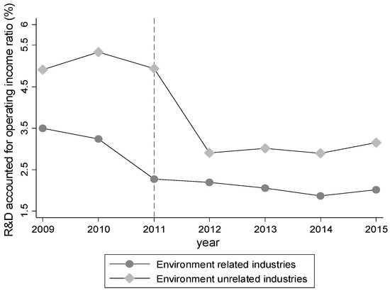 Through the above analysis we can see that, on the whole, the carbon trading policy is a hindrance to the innovation of enterprises, and that heterogeneity exists between the different industries and the different types of enterprise innovation. This heterogeneity is not manifested in all aspects of innovation, mainly in enterprise innovation. In terms of the heterogeneity of the impact of carbon trading policy on enterprise innovation, the previous context does not analyze the process of its specific impact mechanism, which is the focus of this part. Carbon trading policy has a certain hindrance to enterprise innovation in general, and there are differences between the effects of innovation in different industries and types. This section explains it mainly through the enterprise's performance and scientific research. In order to better explain the problem, we draw the different types of business in each year, and the R&D investment accounted for the proportion of the main business income of different enterprises in different industries in order to reflect the enterprise’s research investment situation (Figure 7 and Figure 8).