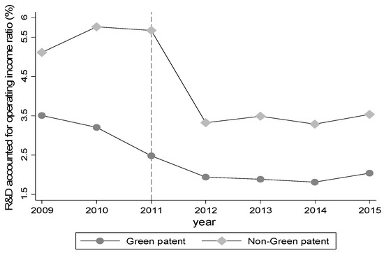 Secondly, comparing the curves’ slope of different types of innovation and different industries , we can see, compared to green technical innovation and environmental industries, non-green technical innovation, and non-environmental industries, the reduction in scientific research is significantly higher. This is the cause of heterogeneity in the impact of carbon trading policy on innovation, because environmental regulation is associated with environmental industry sectors. The impact is more severe, and their willingness to improve technological innovation and reduce costs is even stronger. Those enterprises that are not related to the environmental industry sectors are less motivated to achieve technological innovation.