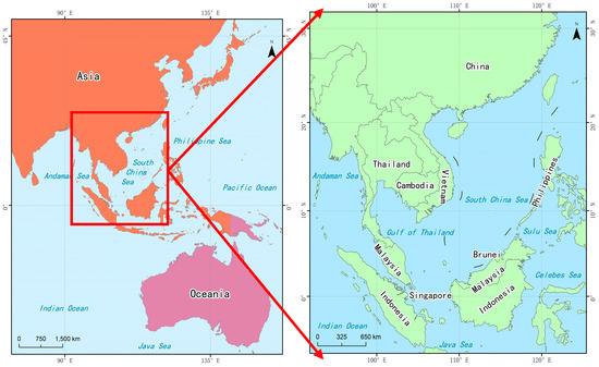 The South China Sea is located in a tropical and semi-tropical region, between the latitudes of 4° S and 24° N and between longitudes 102° E and 123° E. In terms of geographical location, it is the crossroads between Asia and Oceania, connecting the Pacific and the Indian Oceans (Figure 1). As the world’s third largest continental margin sea, the area of the South China Sea exceeds 3 million square kilometers. The South China mainland, Indochina, Malay peninsulas, and the Malay Archipelago surround the sea. There are nine countries around the South China Sea, including China, Vietnam, Cambodia, Thailand, Malaysia, Singapore, Indonesia, Brunei, and the Philippines.