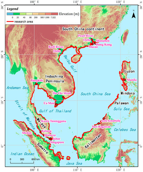 The research area focused on the coasts of the South China Sea, Gulf of Thailand, and the Strait of Malacca. The total length of the coast is 29,022 km. In addition to continental coastline, only land-tied islands and very large islands (area > 3000 km2) were taken into consideration in this thesis. The lengths of the coastline in countries are shown in Table 1. In China, Guangdong Province, Guangxi Province, and Hainan Province were included in the statistics. In Thailand, the coast on the Gulf of Thailand was considered. For Indonesia, it included some coasts of Sumatra and Kalimantan. For the Philippines, it included the west coasts of Luzon, Mindoro, and Palawan.