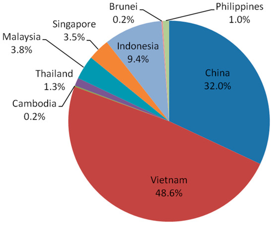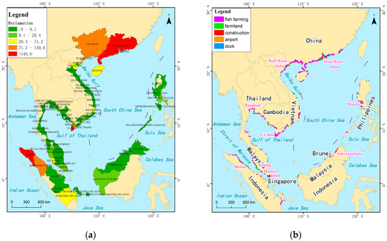 As the main method of utilizing the ocean, sea reclamation is prevailing in many countries, such as Holland, Japan, and Korea [6,7,8]. Countries around the South China Sea also have a long history of sea reclamation. Early land reclamations in Singapore date back to the 19th century and large scale land reclamation projects have taken place since its independence in the 1960s. Land reclamation works occur in most coasts of Singapore Island and the adjacent islands, including Ubin Island, Jurong Island, and Sentosa Island [9,10,11]. China has continuously reclaimed coastal sea areas from the 1950s and sea reclamation has tended to be more extensive, faster, and more large-scaled, especially in the last two decades of 20th century. The land-use types of coastal reclaimed lands vary from agricultural land through to beach aquaculture land to construction and dock land [12,13,14,15,16]. Coastal reclamation works have been carried out in Malaysia since the 1950s and large-scale reclamation projects are concentrated along the coast of the Malacca Strait [17,18]. In Vietnam, Thailand, and Indonesia, large areas of mangrove forest have been filled into land for aquaculture [19,20,21].