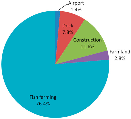 Distributions of sea reclamation are different between countries (Figure 4). In China, sea reclamation was widely distributed in the coastal zone, especially in Guangdong Province. Sea reclamation in Guangdong Province covered a total area of 867 km2, over 80% of the total new area. Meanwhile, the patch area of sea reclamation was relatively large and it showed significantly banded distributions. In Guangxi and Hainan Province, sea reclamation patches were scattered and cracked. Sea reclamation for fish farming was the main type, followed by sea reclamation for construction and docks. The areas were 673, 272, and 128 km2. In China, the coastline was sinuous and irregular, with numerous bays. Sea reclamation for fish farming was evenly distributed in the large and small bays. Among them, the west coast of the Pearl River Mouth and Lei Zhou Peninsula were the most distinctive ones. For construction, it was centered on the both sides of the Pearl River Mouth, covering more than 50% of the total area. Sea reclamation areas for docks were mainly located in Daya Bay, Dapeng Bay, Pearly River Estuary, Huangmao Bay, Qinzhou Bay, and Fangcheng Bay. The distribution of sea reclamation for farming was relatively smaller, concentrated in Qingshui Bay, Zhongshan, and Huangmao Bay, and Jiangmen on the west coast of the Pearl River Mouth.