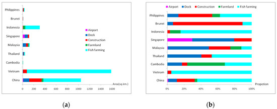 From the land-use types, area, and type composition of sea reclamation in different countries varied greatly (Figure 5). According to the area of sea reclamation, areas for fish farming were located mostly in China, Vietnam, and Indonesia. Especially in China and Vietnam, sea reclamation for fish farming covered an area of 673 and 1511 km2, respectively. Similarly, sea reclamation areas for construction were mainly distributed between China and Vietnam. The areas were 202 and 68 km2, respectively. For sea reclamation for docks, China, Malaysia, and Singapore held a dominant role, and the areas were 128, 61 and 56 km2. In Indonesia and China, sea reclamation areas for farmland were mainly distributed. According to the proportion of sea reclamation, sea reclamation for fish farming was the main type in China, Vietnam, and Indonesia. With respect to sea reclamation for construction, it prevailed in Brunei and the Philippines. In Malaysia and Singapore, the proportion of sea reclamation for docks was the largest. For farmland, it belonged to Cambodia.