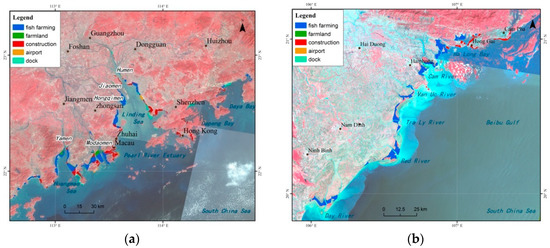Sea reclamation in estuarine deltas. (a) Sea reclamation in the Pearl River Delta. (b) Sea reclamation in the Red River Delta.